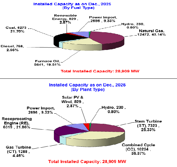 Present Installed Generation Capacity (MW) as on 31st December 2025 Public Sector | No of Power Plant | Installed Generation Capacity (MW) | | BPDB | 40 | 6,461 | | APSCL | 5 | 1,394 | | EGCB | 4 | 1032 | | NWPGCL | 7 | 1,401 | | B-R Power gen | 3 | 472 | | RPCL | 4 | 392 | CPGCBL | 1 | 1150 | | Subtotal | 64 | 12,302 (43%) | Joint Venture | | | | BCPCL (JV of NWPGCL & CMC, China) | 1 | 1,244 | | BCPCL (JV of BPDB & NTPC, India) | 1 | 1,234 | | RNPL (JV of RPCL & Norinco) | 1 | 590 | | Subtotal | 3 | 3,068 (11%) | Private Sector | | | | IPPs | 63 | 10,572 | | SIPPs (BPDB) | 0 | 0 | | SIPPs (REB) | 3 | 130 | | 15 YR. Rental | ০ | ০ | | 3/5 YR. Rental | 0 | 00 | | Rental(No Electricity No Payment) | 2 | 141 | | Subtotal | 68 | 10,843 (37%) | Power Import | | | | Bheramara HVDC | | 1,000 | | Tripura | | 160 | | Jarkhondo (India), Adani Power | | 1,496 | | Import (Nepal) | | 40 | | Subtotal | | 2,696 (9%) | | TOTAL | 135 | 28,909* |