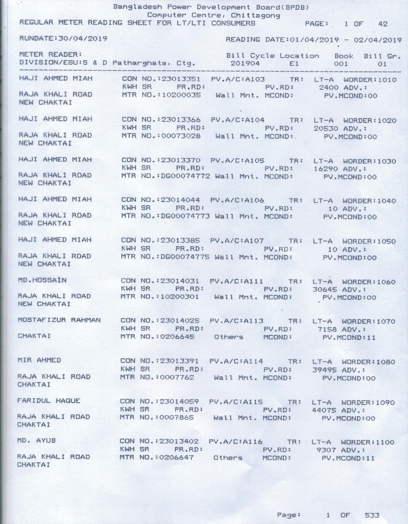 ৩। মিটার রিডিং শীট
